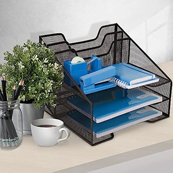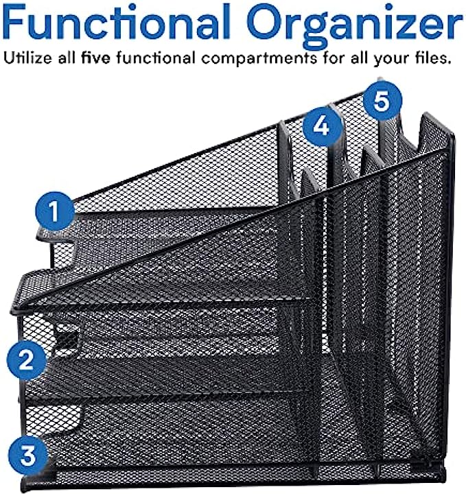 • Clutter-free Workspace - These desk organizers feature 5 storage compartments, perfect for keeping files, folders, papers, sticky notes, supplies for office, and other accessories neat and accessible