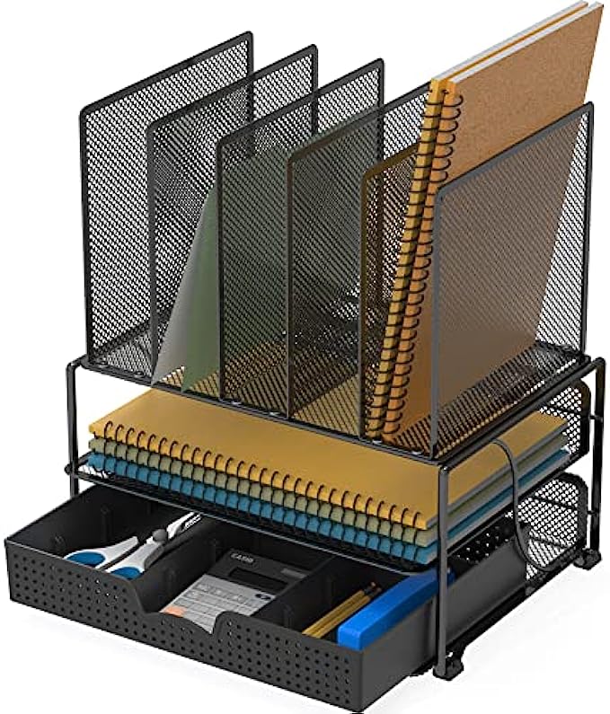 SimpleHouseware Mesh Desk Organizer with Sliding Drawer, Double Tray and 5 Upright Sections, Black