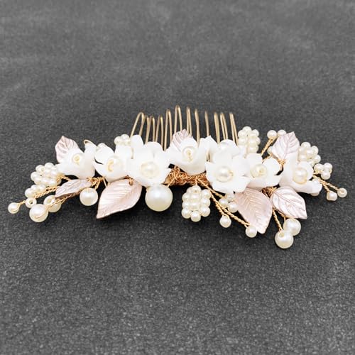 Sponsored Ad - BETITETO Bridal White Hair Comb Pearl Leaf Ceramic Flower Hair Pin Piece Accessories for Wedding Women