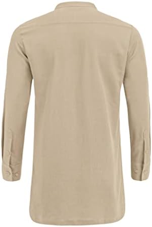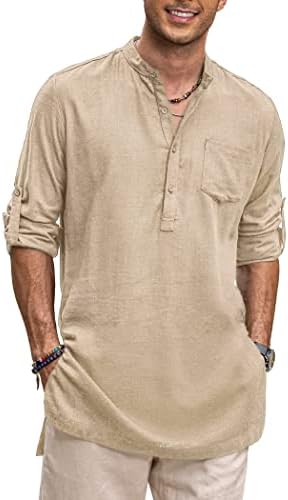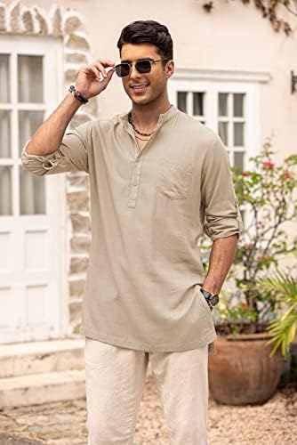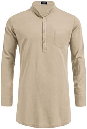 Men's Linen Henley Shirts Long Sleeve Collarless T-Shirts Longline Kurta Beach Shirts with Pocket