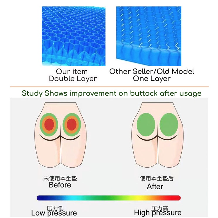 Appearance:looks good . Suitability:suitable for long duration sitting . Quality:good quality . Double layer design / new improved features for long periods of time sitting. Relief pressure on buttock especially long hours sitting. It comes with a custom made cover and a zipper that can be opened. The honeycomb breathable material cushion is washable. Size is 36 centimetres by 42 centimetres. Very fast delivery. Thanks seller and his team for their service and support. Good luck!