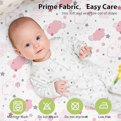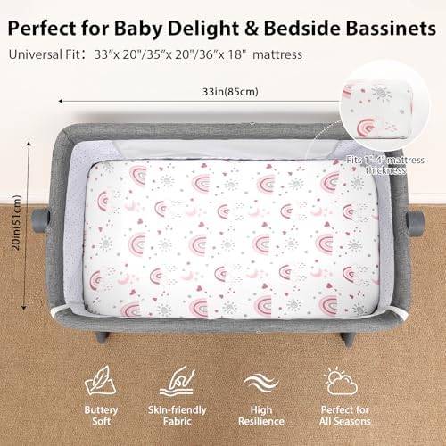Baby Bedside Bassinet Sheets Fitted Girl, 33”x20” Compatible with Baby Delight Dream On Me & Most Rectangle Bedside Sleeper Bassinet Mattresses, Super Soft Microfiber Pink Rainbow