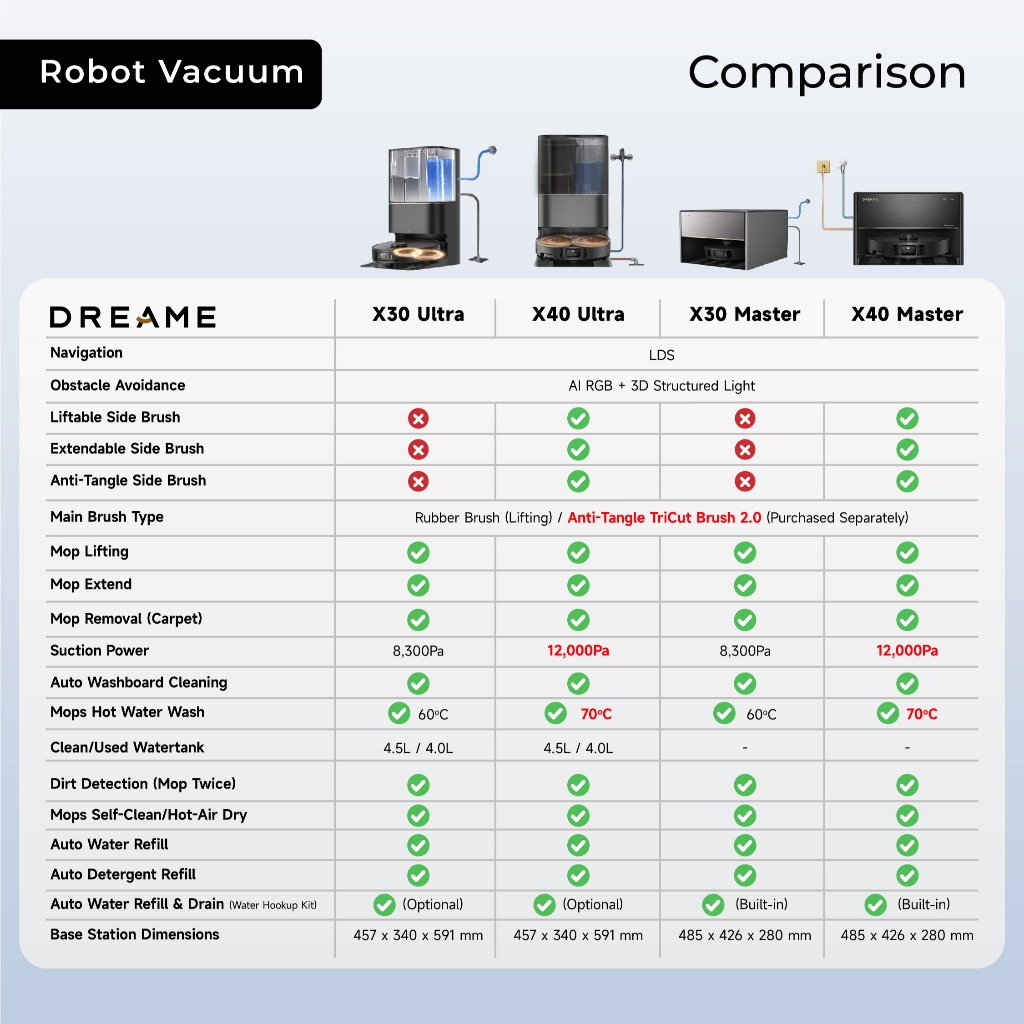 Performance:Excellent Best Feature(s):Automation Value For Money:Yes This product keeps my whole house spotless! Luckily, I opted for the water kit, which automatically refills and disposes of waste water! The DreameHome app comes with customizable cleaning functions and nicely maps out your house. Super satisfied with the purchase! The X30 Master fits nicely in my kitchen cabinets. The installer was super friendly and clear when teaching how to operate the product.!