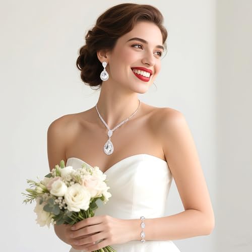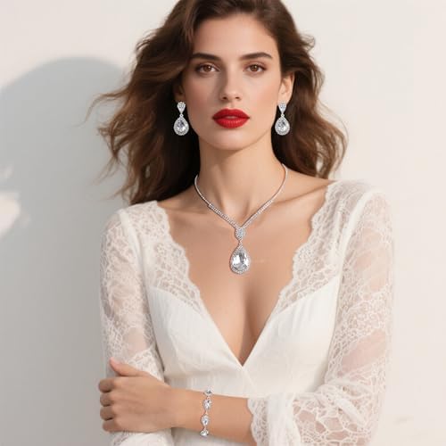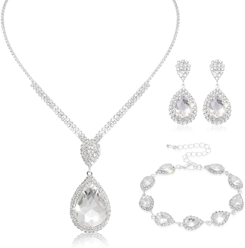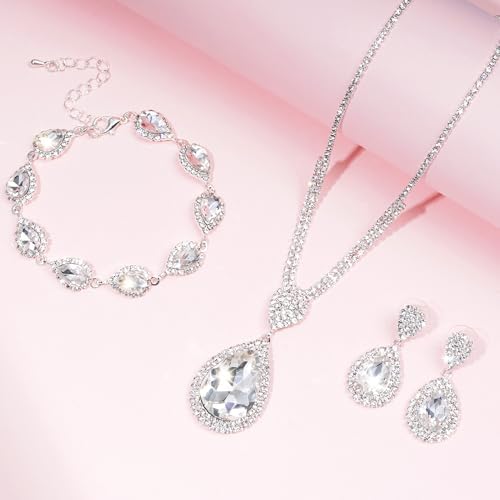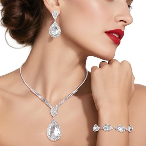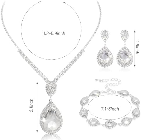 Silver Bridal Wedding Jewelry Sets for Women Crystal Bridal Necklace Earrings Bracelet Set Rhinestone Choker Necklace for Brides Bridesmaids Prom Party Costume (Silver)