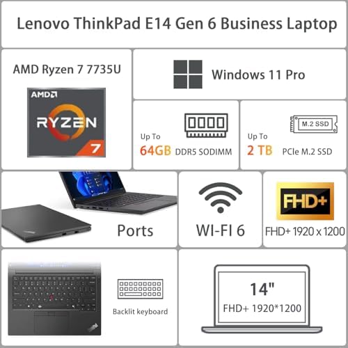 ThinkPad E14 Gen 6 Business Laptop, 14" FHD+ Display, AMD Ryzen 7 7735U, 32GB DDR5 RAM, 1TB SSD, Fingerprint, Backlit, Wi-Fi 6, Windows 11 Pro, Bundle with Targus USB-C 100W Docking Station
