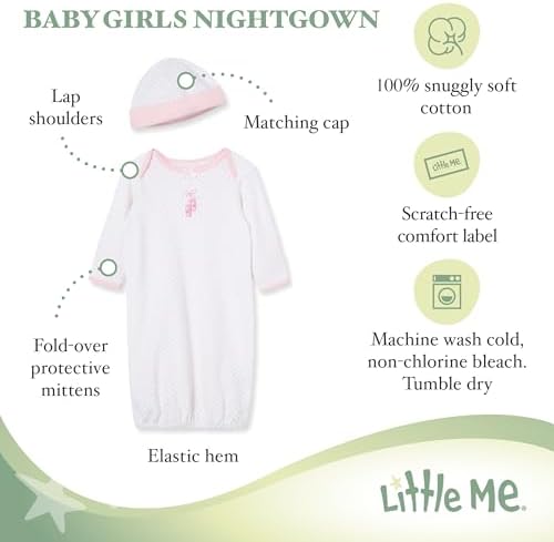 Little Me Clothes for Baby Girls' 2-Piece Nightgown and Cap Set 100% Cotton with Elastic Bottom, Baby Essentials, 0-3 Months