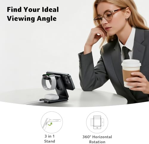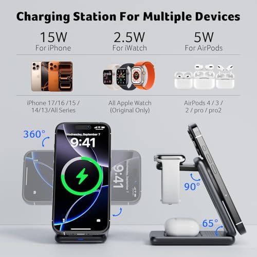 Magnetic Wireless Charger,3 in 1 Wireless Charging Station,15W Fast MagSafe Charger for iPhone 17 16 15 14 13 12 Series-Apple Watch 10 9 8 7 6 5 4 3 2 SE and Ultra Series-Airpods 4 3 2 Pro Series