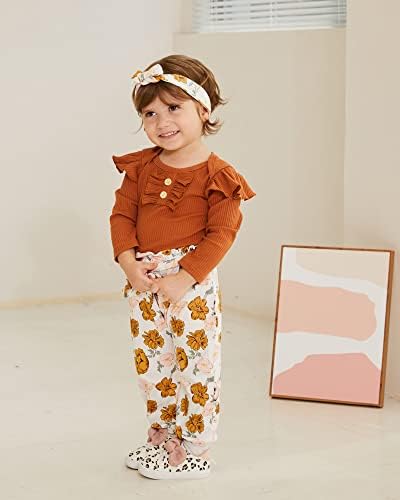 Newborn Baby Girls Clothes Ribbed Ruffled Romper+Floral Pants+Headband Infant Outfit Set