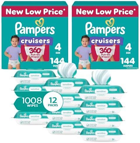Pull On Cruisers 360° Fit Disposable Baby Diapers Size 4, 2 Months Supply (2 x 144 Count) with Sensitive Water Based Wipes 12X Multi Pack Pop-Top and Refill (1008 Count)