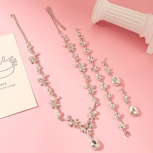Bridal Wedding Elegant Floral Jewelry Set for Women/Brides/Bridesmaids Crystal Jewelry Set for Wedding Prom Party Bridal Crystal Necklace Earrings Bracelet Set