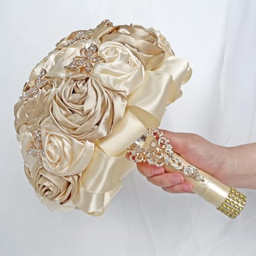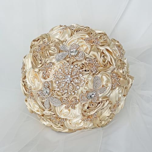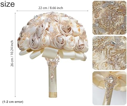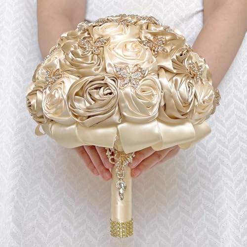 Sponsored Ad - Handmade Floral Satin Rose Butterfly Shape Rhinestone Bridal Bouquet Luxury Golden Rhinestone Artificial Flowers for Wedding