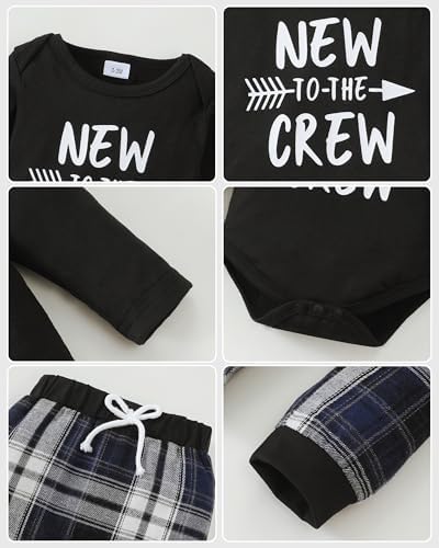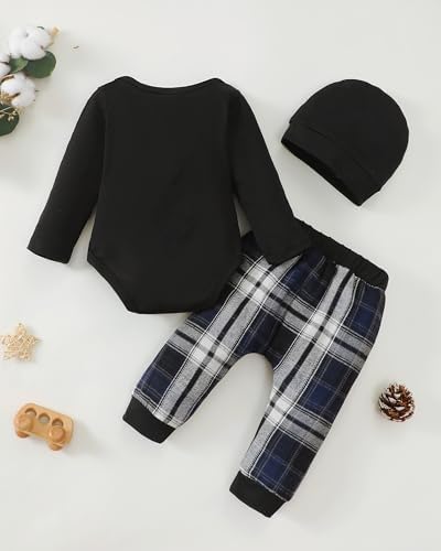 Newborn Baby Boy Fall Clothes, Long Sleeve Letter Printed Rompers Plaid Pants Hat Outfits Clothing Set 0-18 Months