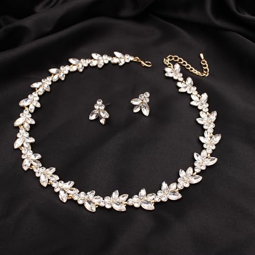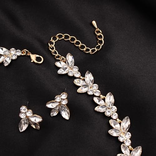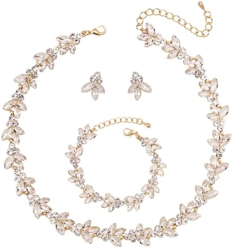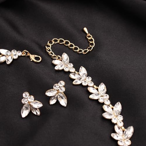Bridal Wedding Crystal Leaf Choker Necklace Dangle Earring Bracelet Brides Bridesmaid Jewelry Set for Women