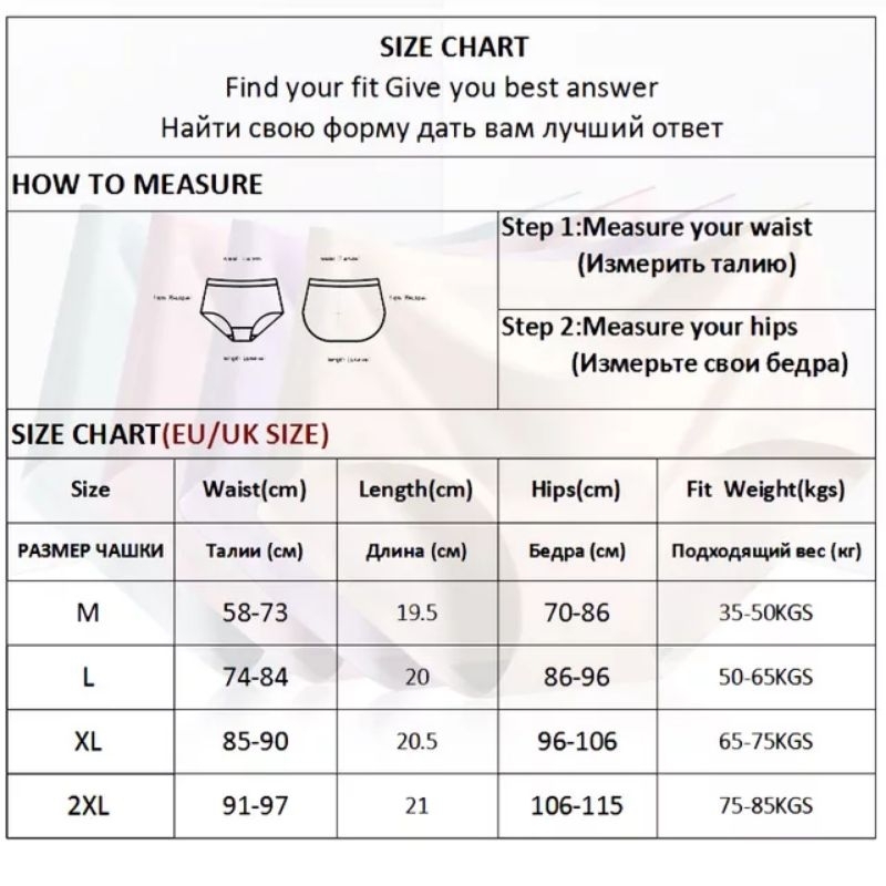 Colour:As per described Material Quality:Soft and comfy My waist is about 68-70cm, hips are around 88cm. I’m 49 kg but bought XL (62-72kg), fits just nice. The middle part is glued on rather than stitched on, but the sides of the grey part are under the underwear’s cloth, so it is slightly reinforced.