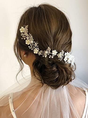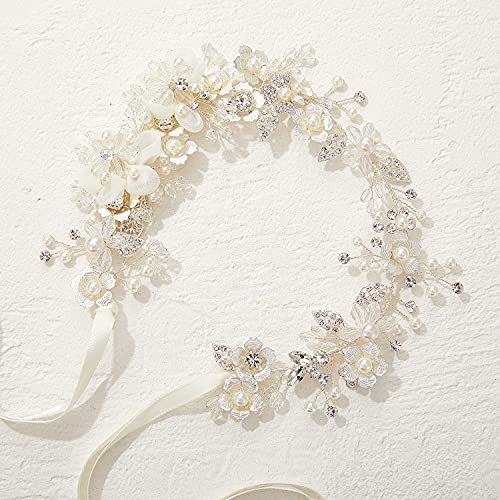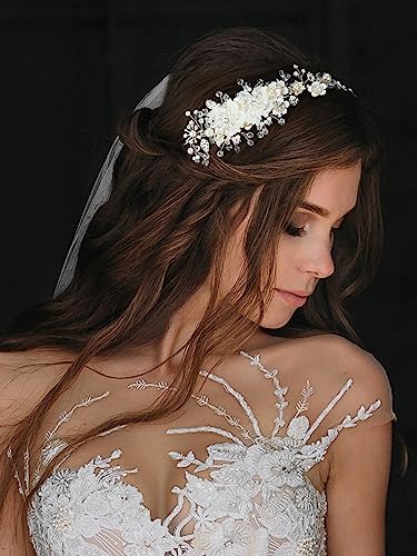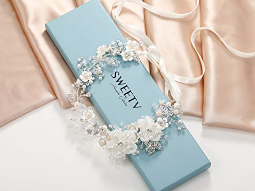SWEETV Pearl Bridal Headband Sliver Wedding Headpieces for Bride, Crystal Flower Hair Accessories for Women Girls