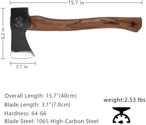 15.7" Hand Forged Hatchet Axe, Camping Hatchet with 1065 Carbon Steel & Wooden Handle, Bushcraft Axe with Leather Sheath and Axe Sharpener, Survival Axe for Outdoor Adventures and Gardening