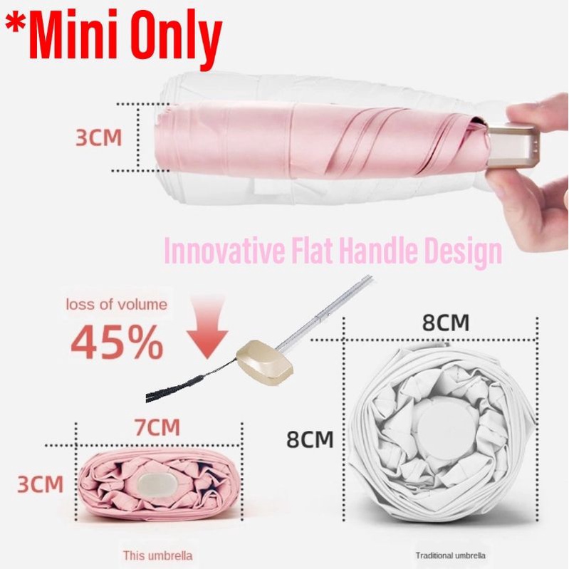 Appearance:Pretty pink! ? Performance:Seems decent Quality:Seems decent Brought this to replace my old compact umbrella. This seems to be flatter/skinner than my old one. Think it can only fit 1 pax, 2 if both of you are very skinny ? have yet to use em. Would preferred the cover to not have any wording haha ?