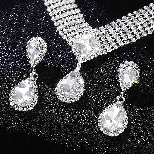 Unicra Crystal Bridal Wedding Jewelry Set Silver Teardrop Necklace Earrings Bracelet Sets Rhinestone Prom Jewelry Accessories for Women and Brides
