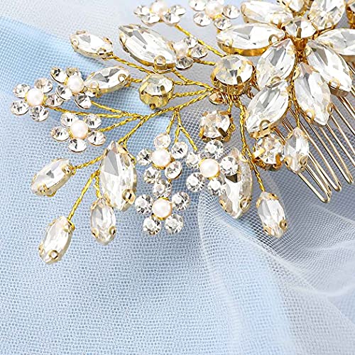 Unsutuo Crystal Bride Wedding Hair Comb Silver Rhinestone Flower Bridal Hair Pieces Pearl Wedding Hair Accessories for Women and Girls… (Gold)