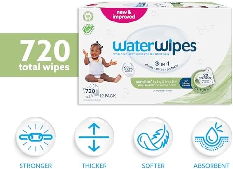 Sensitive+ Baby & Toddler Wipes, 3-In-1 Cleans, Cares, Protects, 99.9% Water, Textured Clean, Unscented & Hypoallergenic, 720 Count (12 Packs)